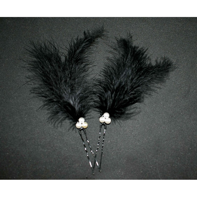 l'épingle est en métal noir, les plumes et les perles fines sont noires et blanches.