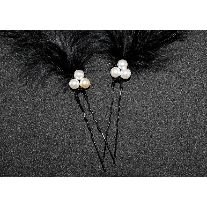 Bijoux de tête, épingle à cheveux noires aux plumes noires et blanches et aux perles blanches et noires