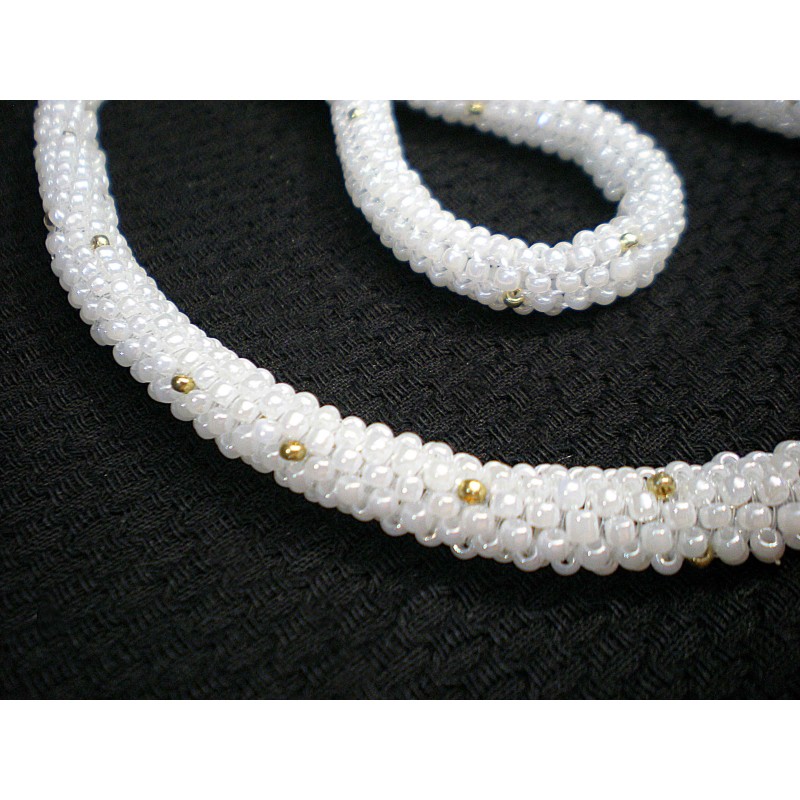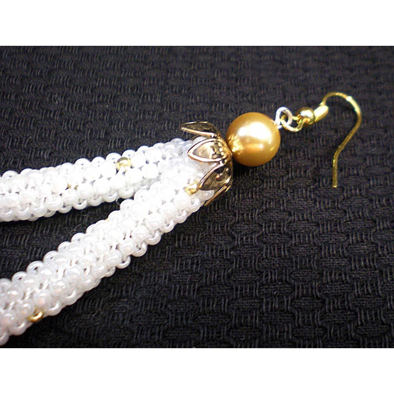 Voici un collier et ses boucles d'oreille en peyote circulaire réalisé en perles de rocailles blanches et dorées et perles fines dorées.