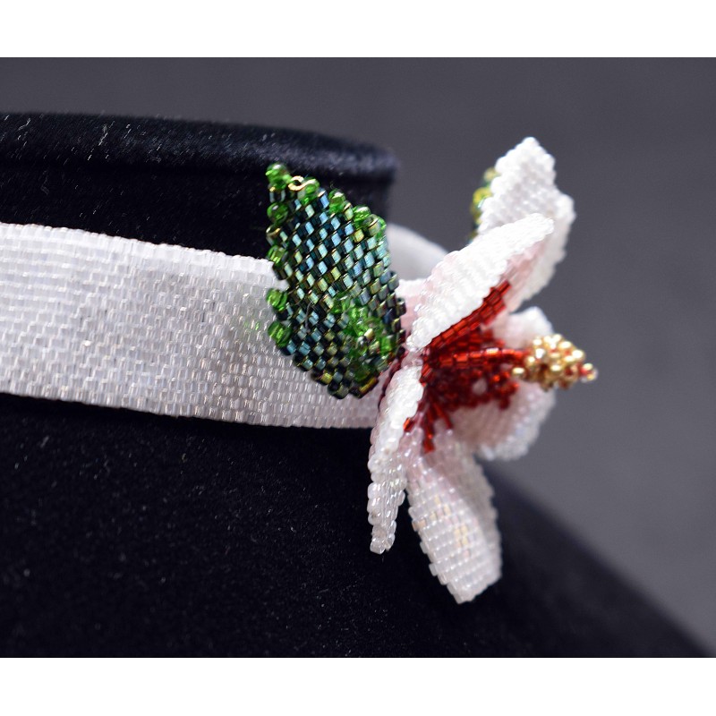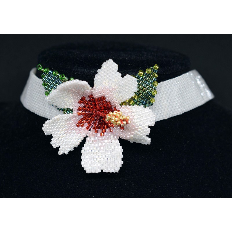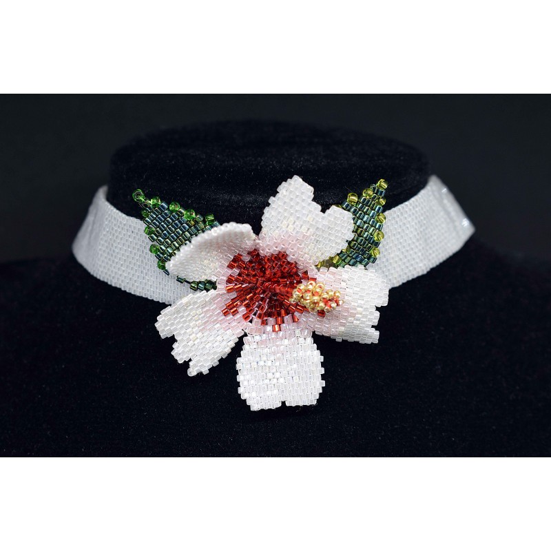 Collier ras du cou en peyote, perles blanches, rouges et dorées "hibiscus"