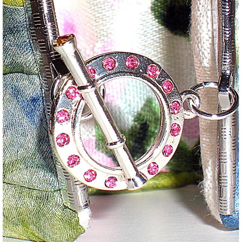 Le fermoir est un fermoir T argenté et strassé rose.