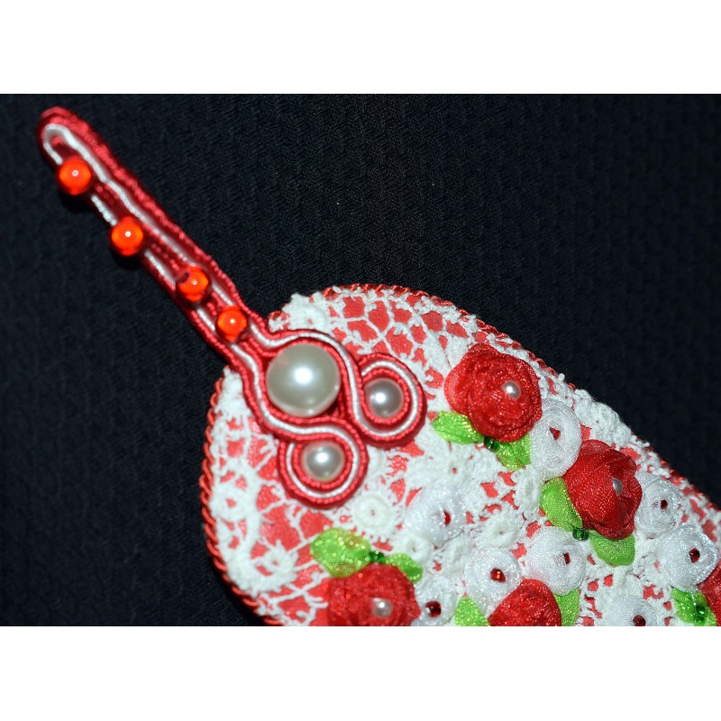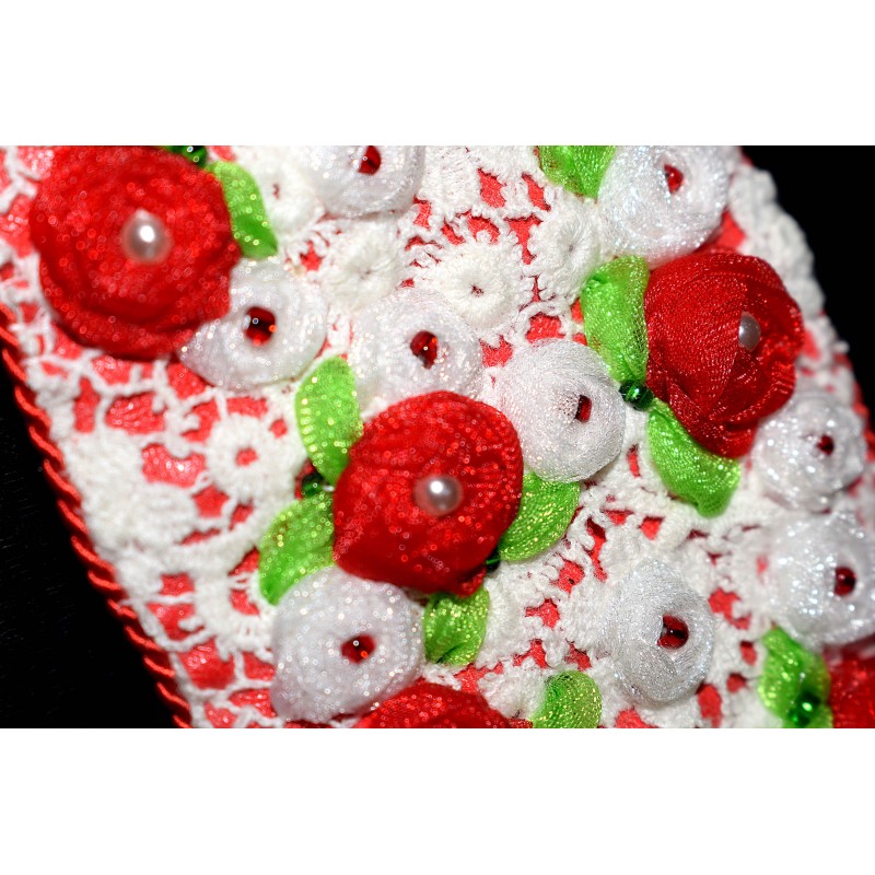 | Compositions | tissu, perles miracles et fines, dentelle blanche, simili cuir rouge, soutache blanche et rouge et ruban d'organza rouge, blanc et vert |