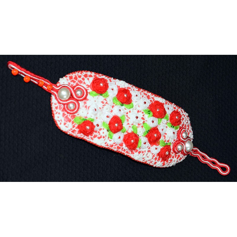 Bracelet en shibori et soutache brodé de roses rouges et blanches