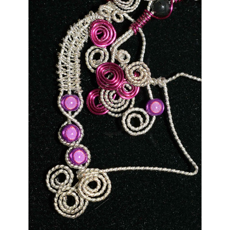 Collier en wire wrapping et perles violettes miracles, fil de laiton argenté structuré et d'aluminium violet