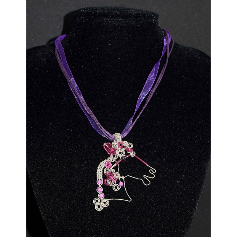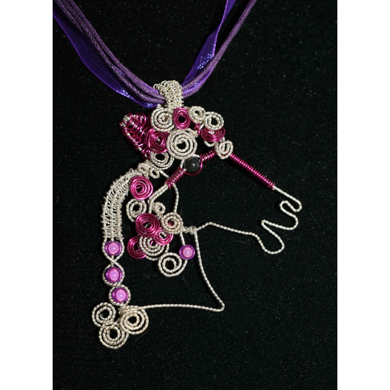 Voici un magnifique collier réalisé en wire wrapping et perles pour tous les amoureux des chevaux. Le fil de laiton est argenté structuré et le fil d'aluminium est violet. Les perles violettes sont des perles miracles.