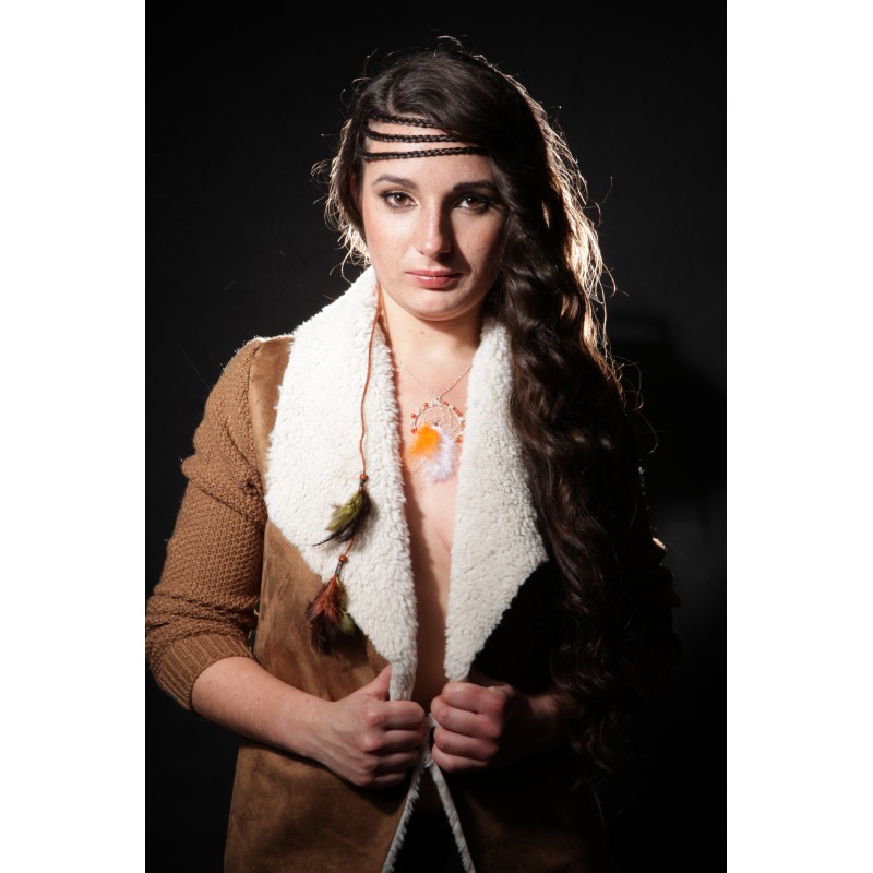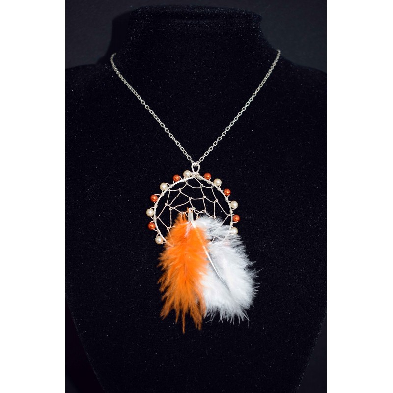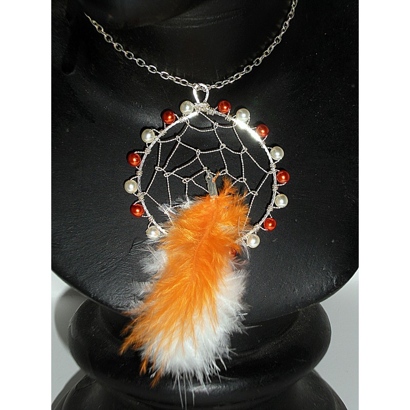 Collier argenté en wire wrapping, style indien, attrape rêve aux plumes oranges et blanches