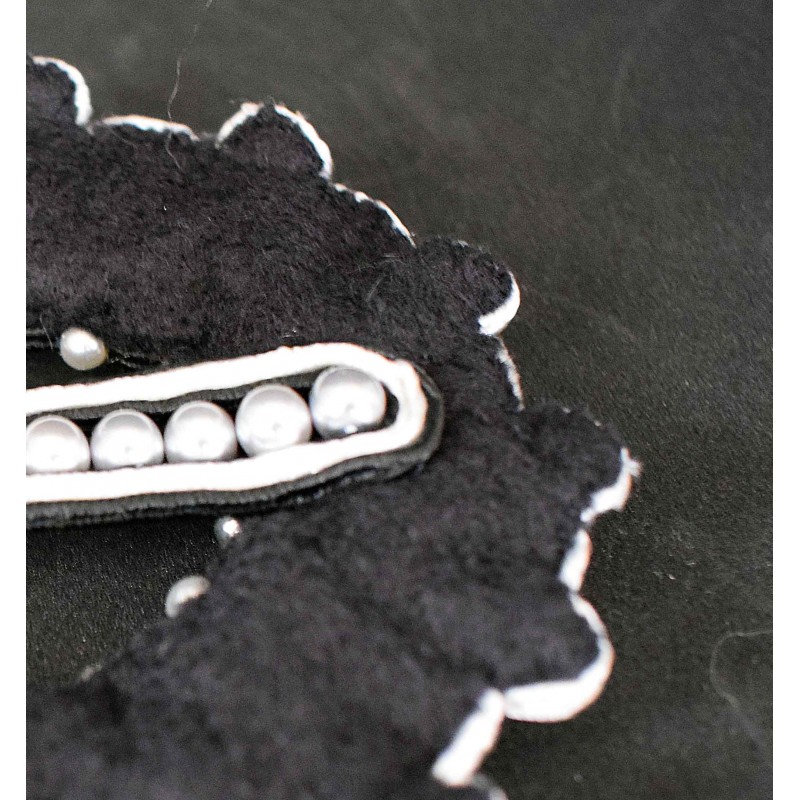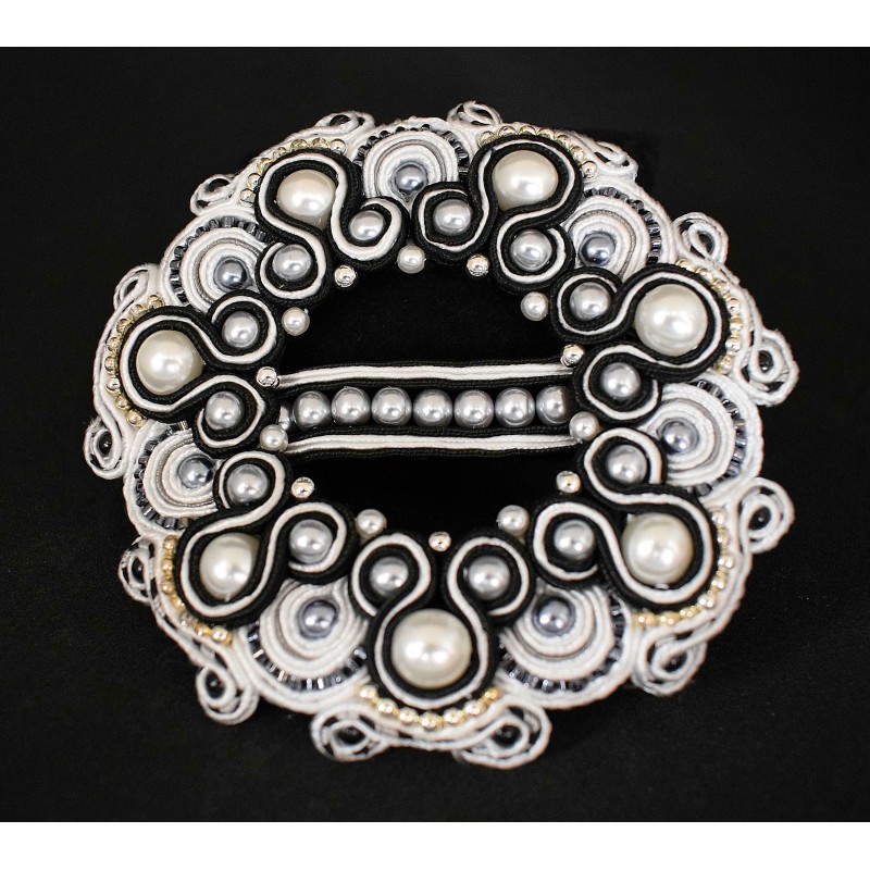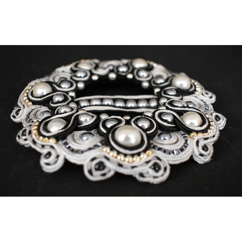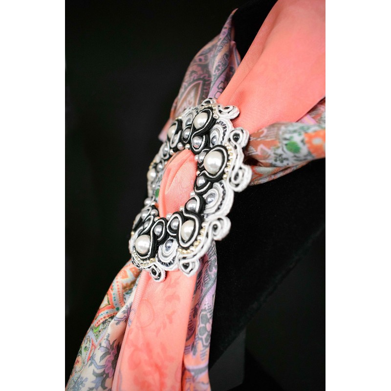 Boucle de foulard en soutache et perles diverses blanches, grises, noires et argentées