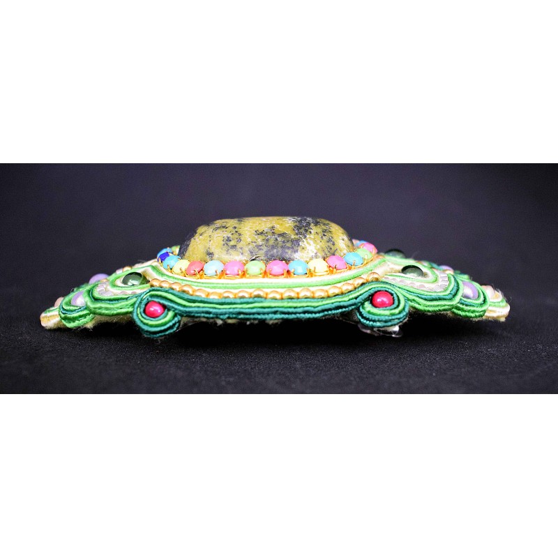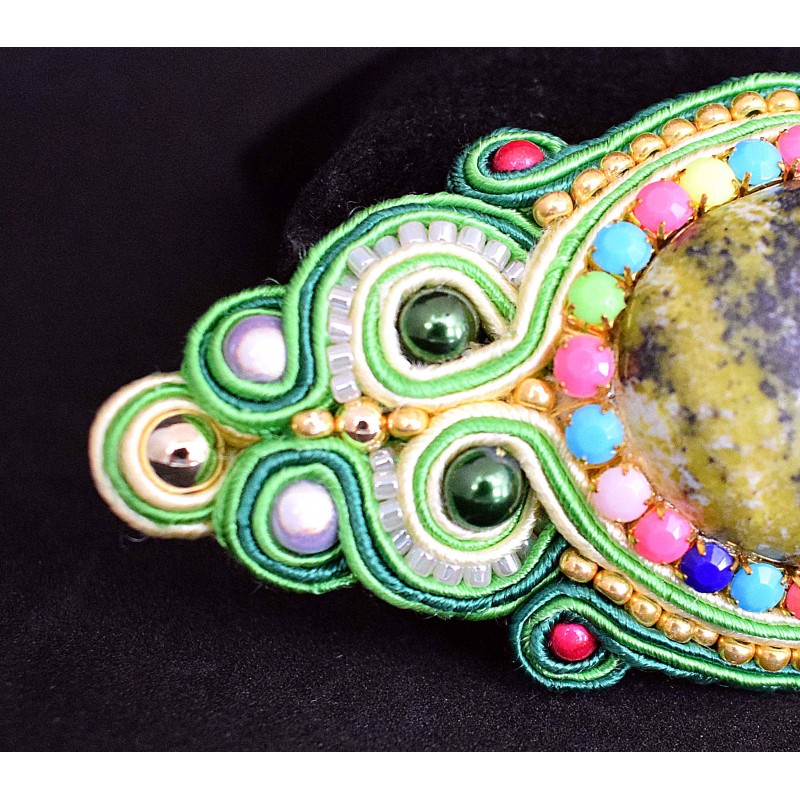 Elle est réalisée en soutache aux tons verts jaunes. Différentes perles la décorent, tel que des perles miracles,des perles fines, des métallisées, des délica, des strass et une très belle perle semi précieuse " Serpentine".