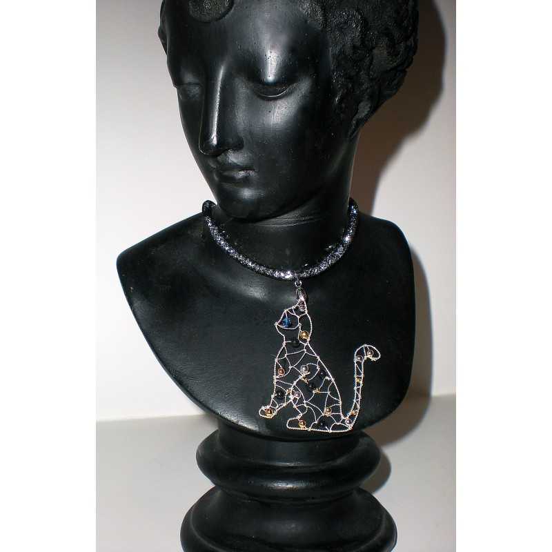 Collier en wire wrapping"chat assis", résille noire et ses strass cristal.