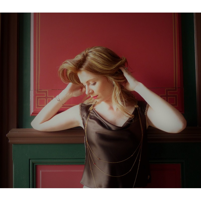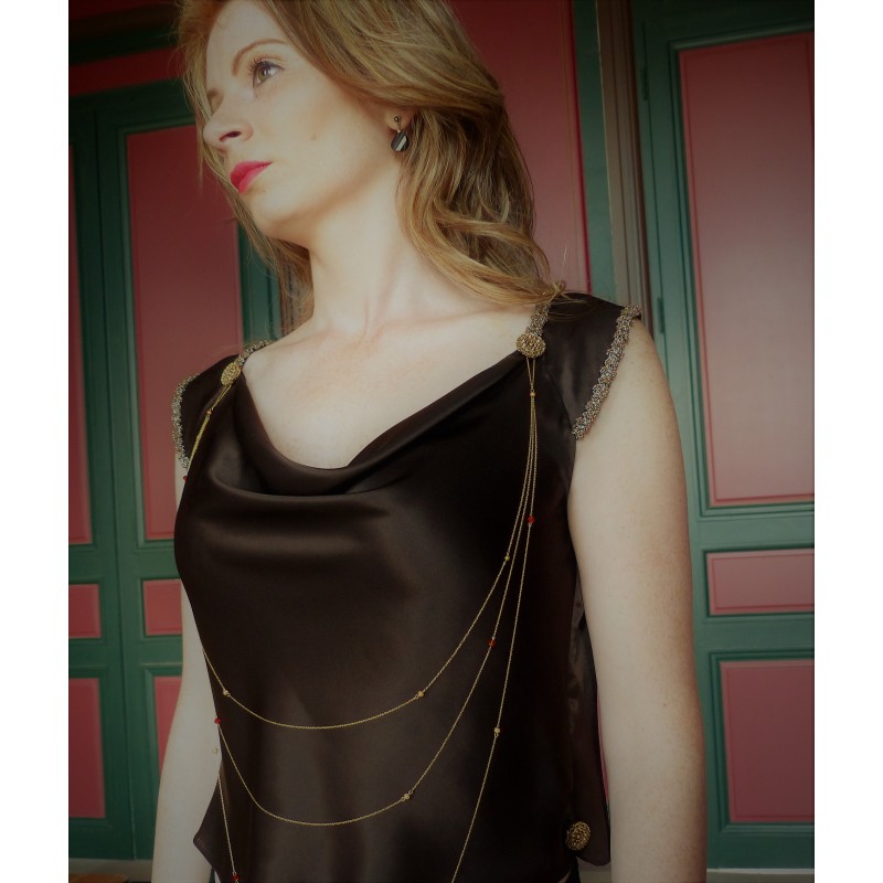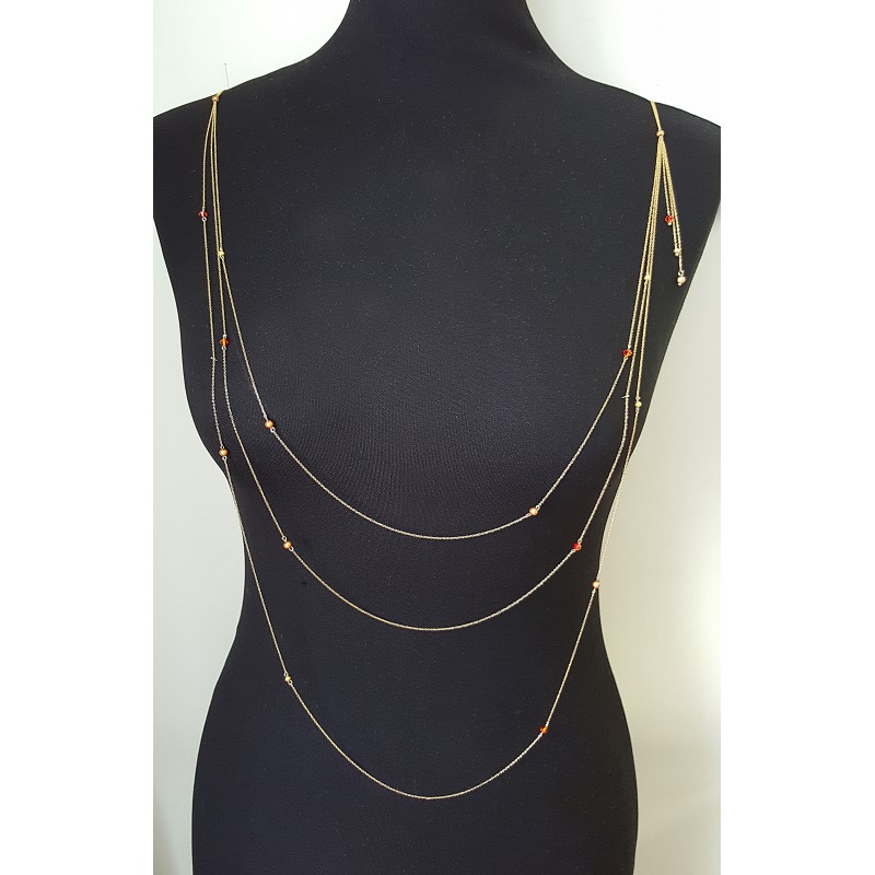 Voici un ravissant bijou de vêtement 3 rangs pour sublimer un top. Il est réalisé en chaine ultra fine à mailles de 1 mm x 0,5 mm 16 carats plaquée or Ornée de cristaux Swarovski® rouges orangés, de perles stardut en plaqué or et des perles miracles marrons.