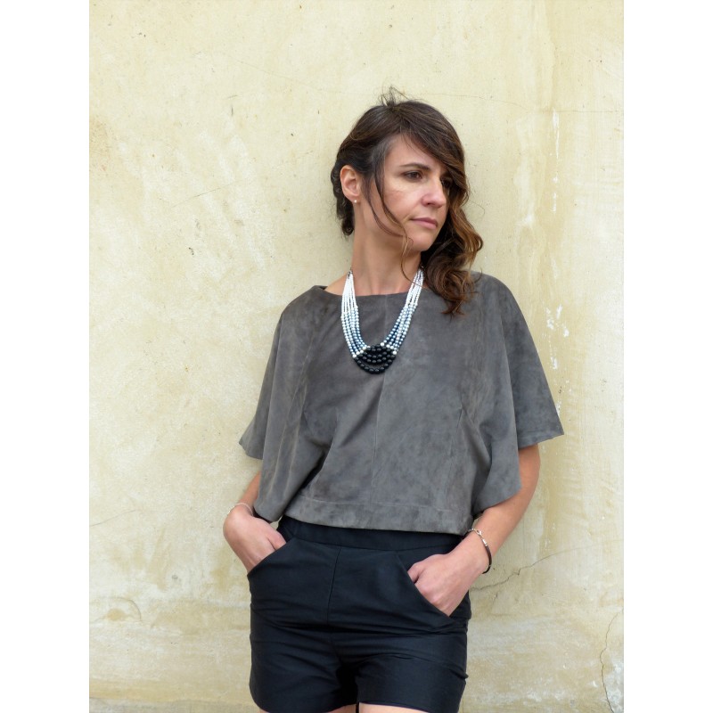 | Compositions | perles fines noires, blanches, grises et argentées |