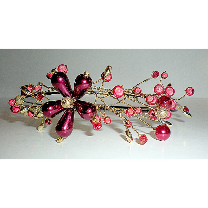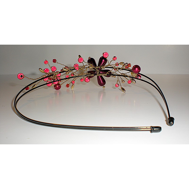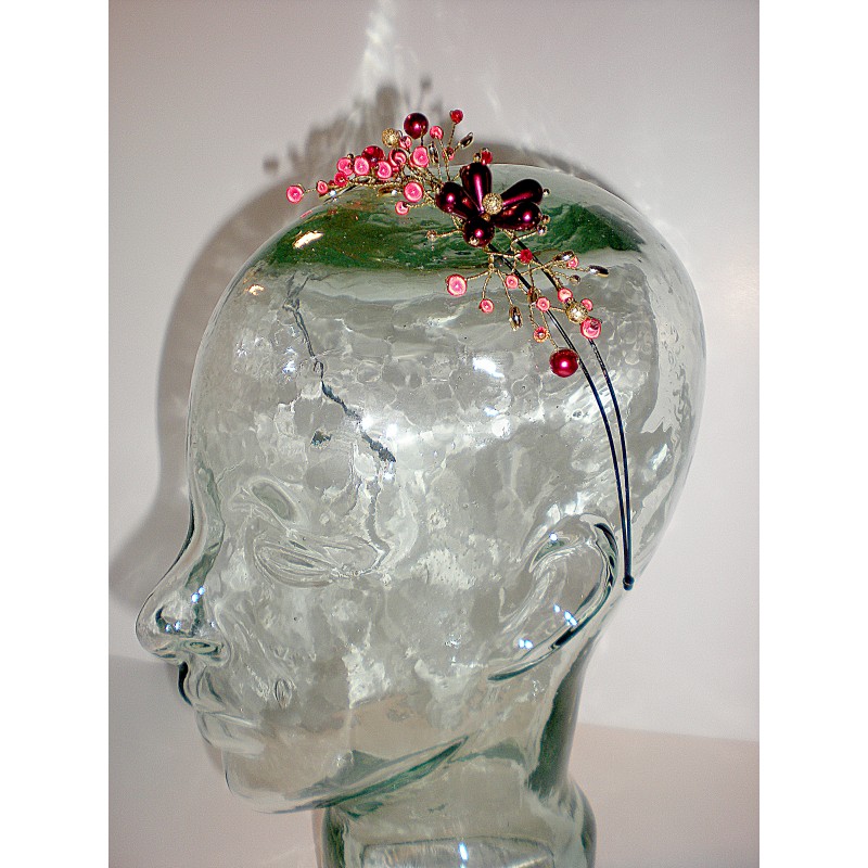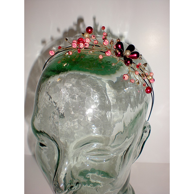 Serre tête en métal noir et doré, perles fines rouges, bordeaux et dorées réalisé en wire wrapping