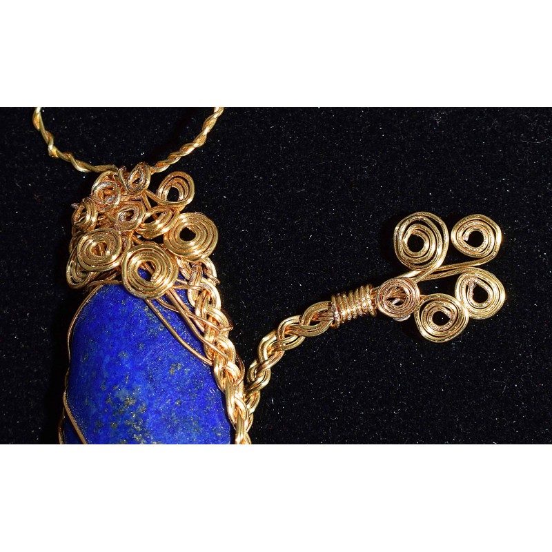 Voici un collier très original pour tous les amoureux des chats. Il s'agit d'un collier réalisé en wire wrapping en fil de laiton doré et Orné d'une magnifique perle semi précieuse "lapis lazuli".
