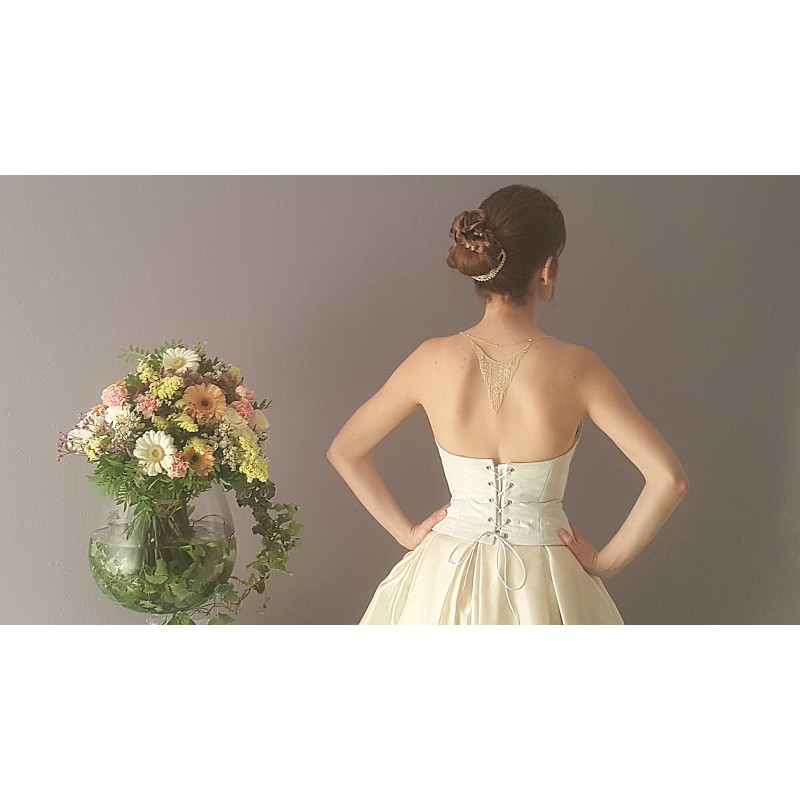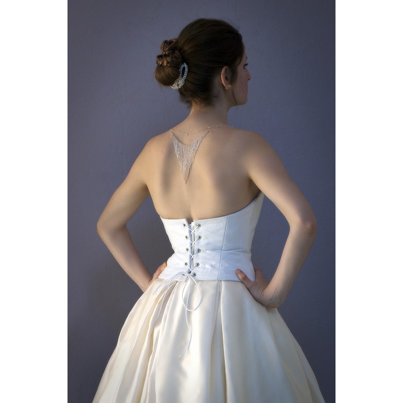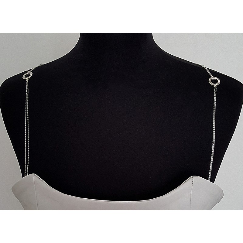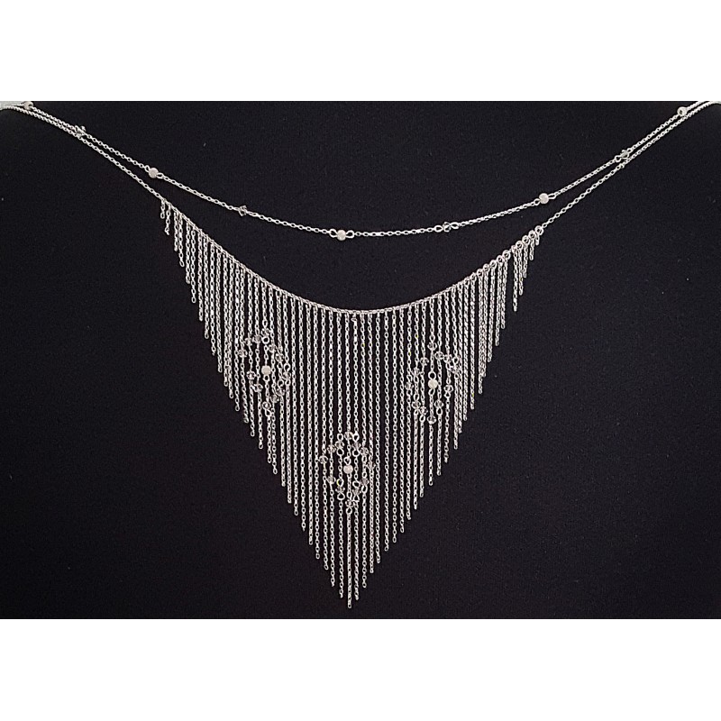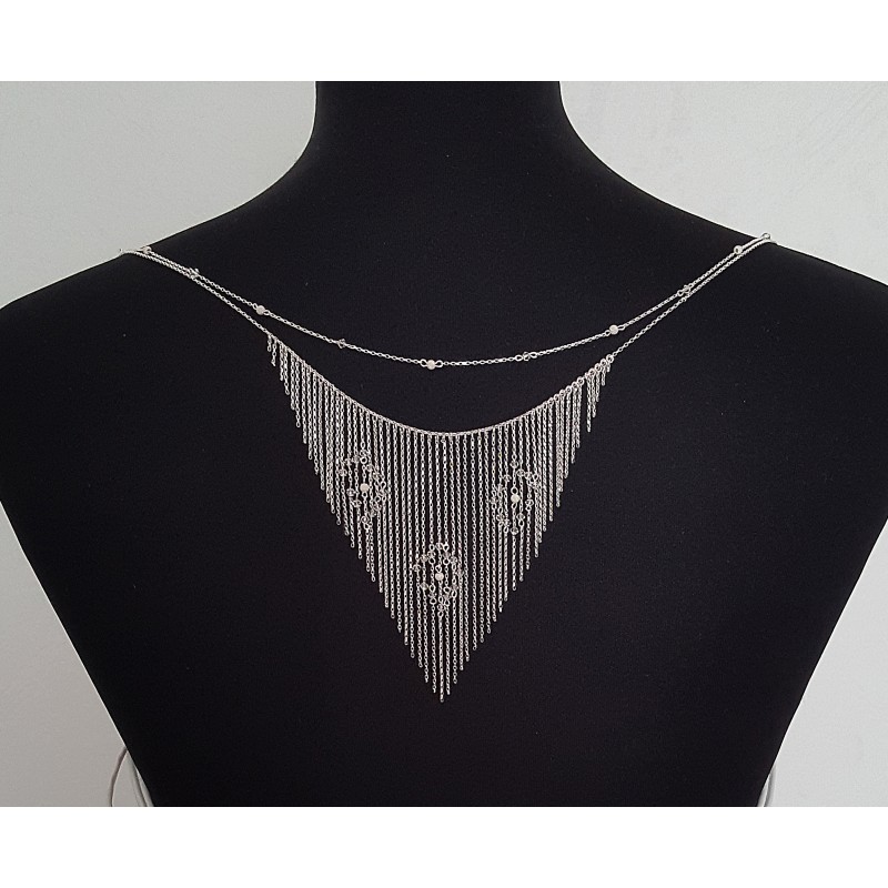 Voici un ravissant collier de dos pour sublimer le dos d'une mariée. Il est réalisé en chaines d'argents 925 Orné de cristaux Swarovski® ainsi que d' intercalaires en argent 925 et perles diamantées en argent 925.