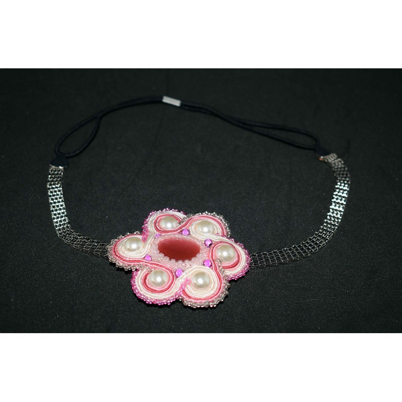 Serre tête métal argenté à la fleurs en soutache fushia et ses diverses perles
