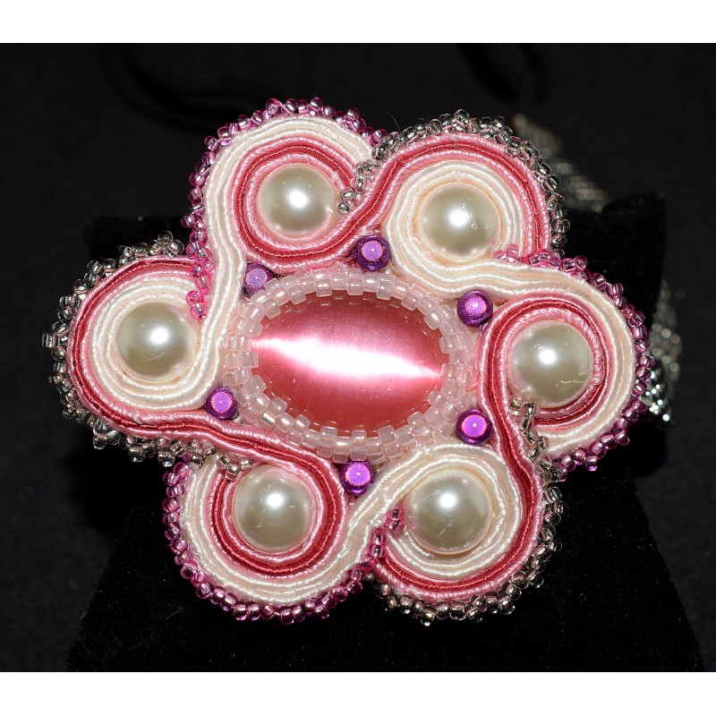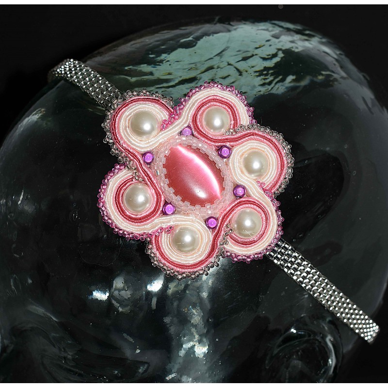 Disciplinez vos cheveux avec cette accessoire à cheveux. Accessoire indémodables pour tous les styles. Bijou de tête en métal argenté, très original, réalisé en soutache blanche et dégradé de rose avec diverses perles tel que des perles fines, des rocailles, des miracles, des délica et une très belle perle semi précieuse "calcédoine rose".