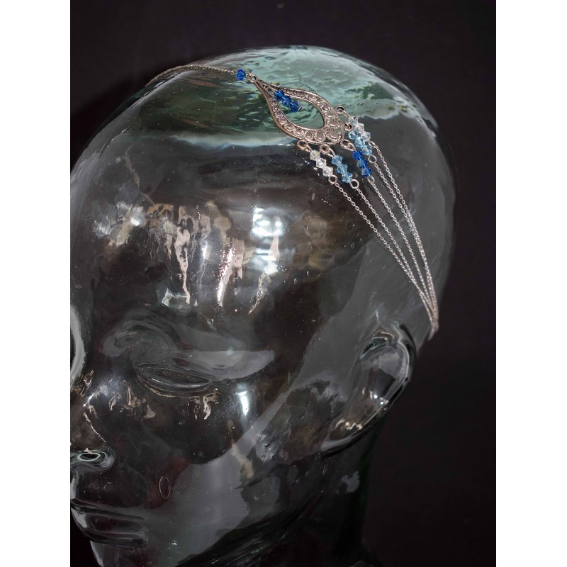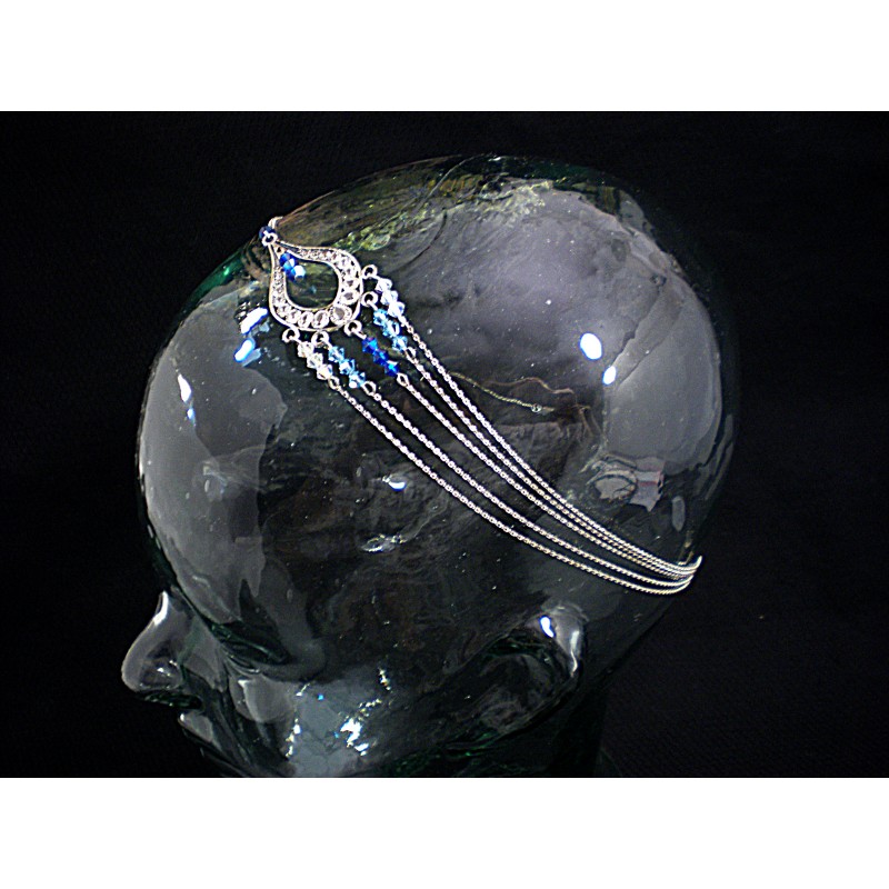 Disciplinez vos cheveux avec cette accessoire cheveux. Accessoire indémodables pour tous les styles. Bijou de tête très original réalisé avec des petites chaines et un joli intercalaire argenté vieilli 5 rangs. Orné de cristaux Swarovski® bleu et cristal.