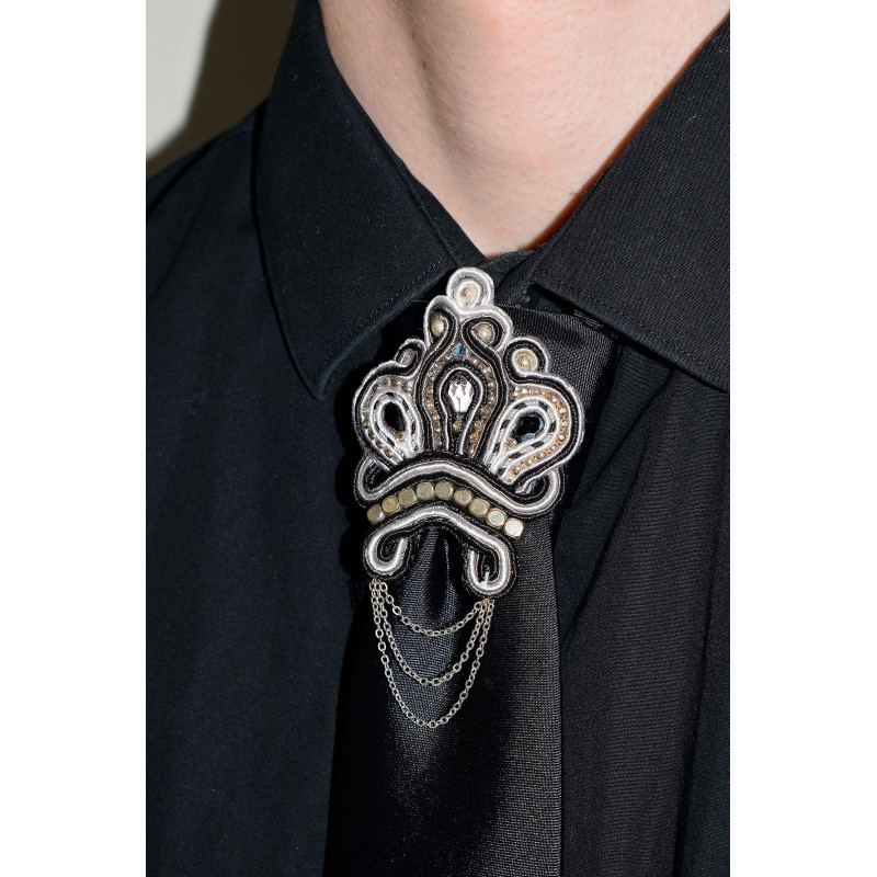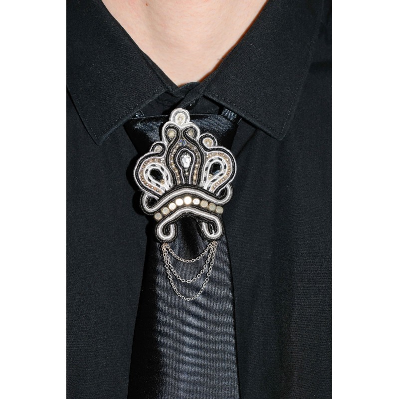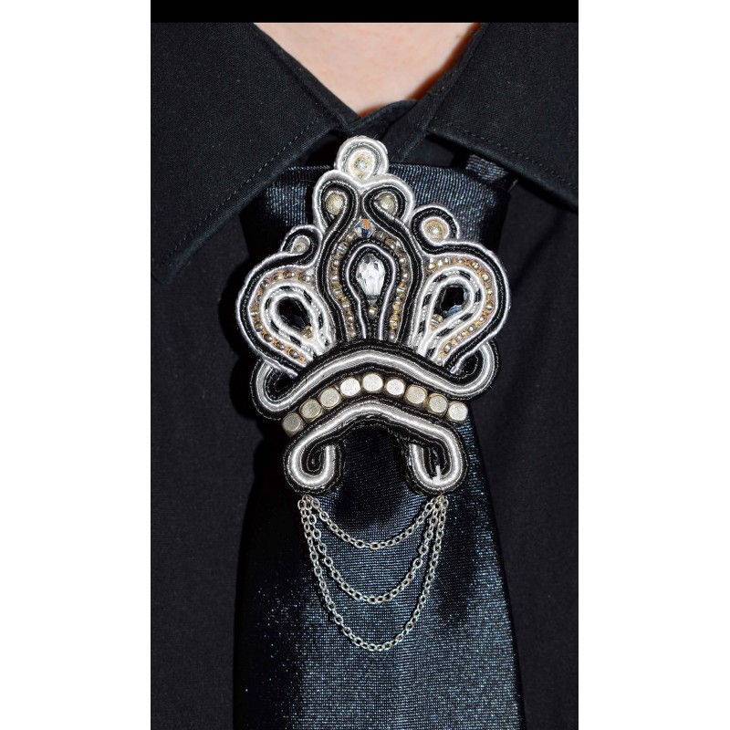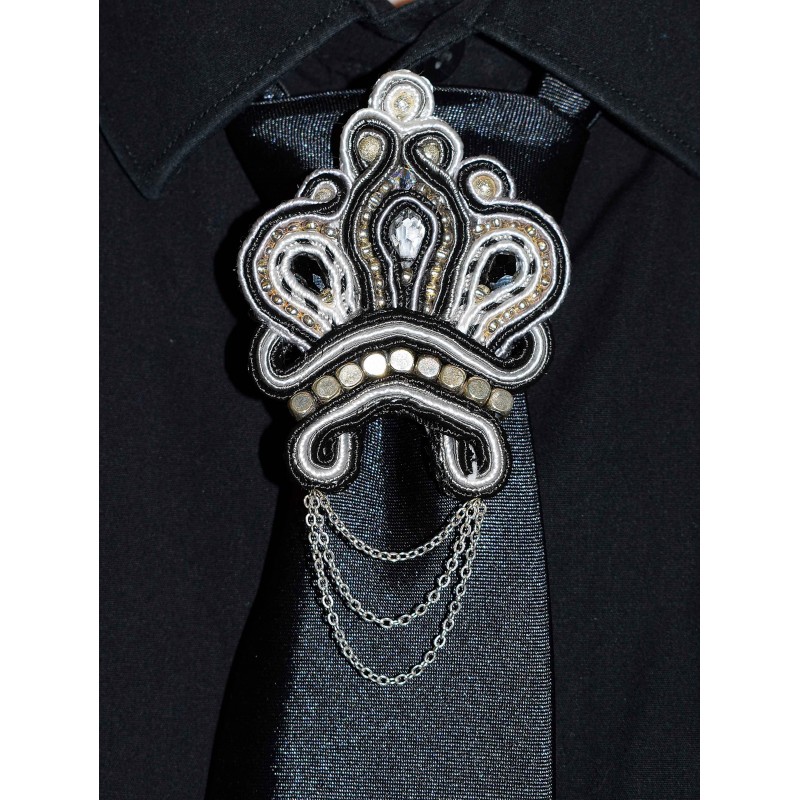 Broche de cravate en soutache noire, grise et blanche, fleurs de lis et chaine plaqué argent