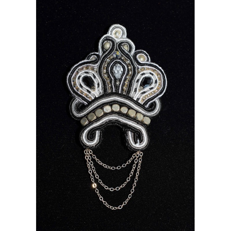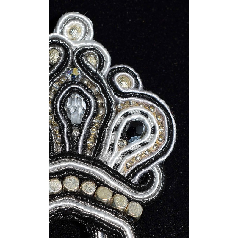 Elle est réalisée en soutache blanche, grise et noire. Les petites chaines sont des chaines en plaqué argent. Différentes petites perles la décore, tel que des perles diamantées argentées, des perles de rocailles à la feuille d'argent, des perles métallisées et des swarovski rondes et en gouttes.