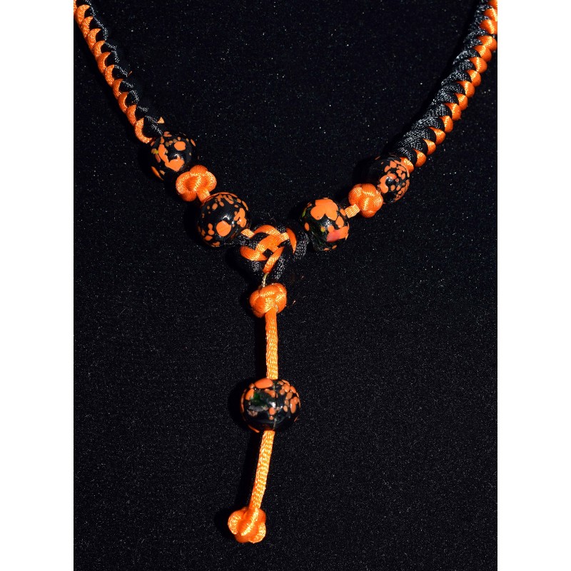 Ce magnifique collier en noeud chinois est fait de 2 Cordons queues de rats satinés oranges et noirs orné de perles fantaisies.