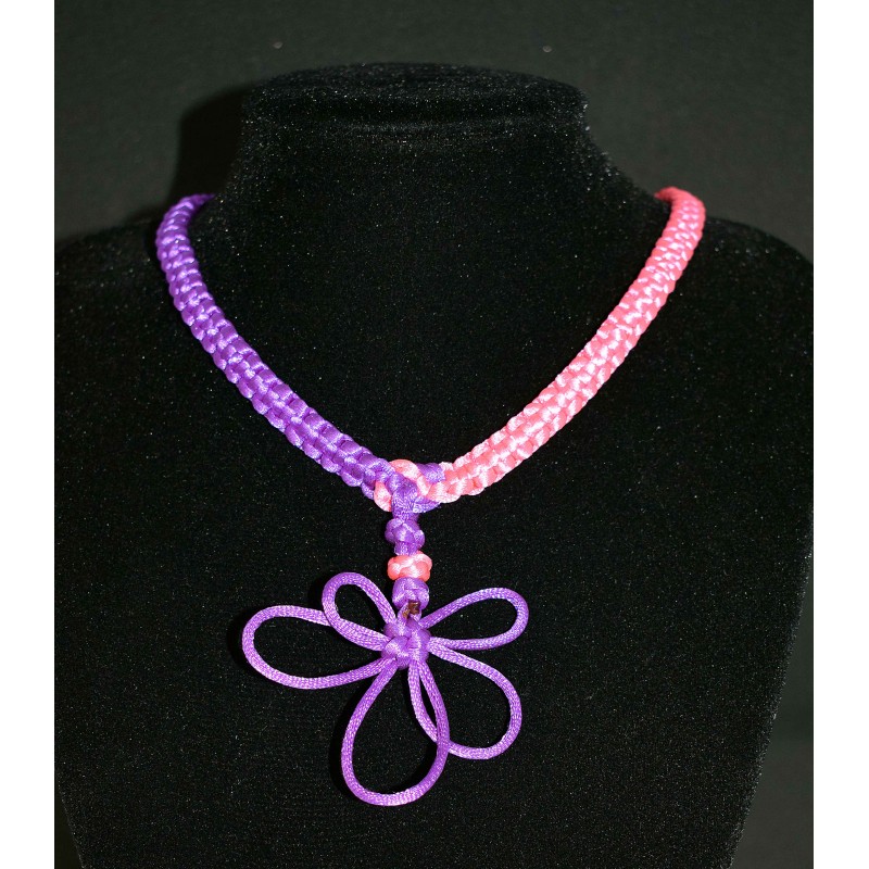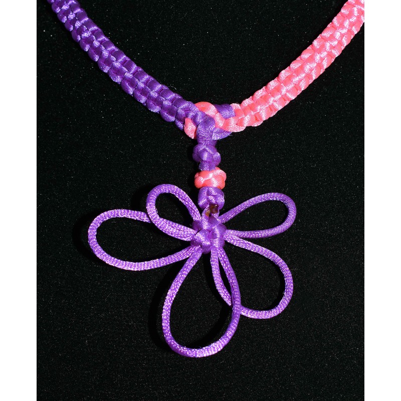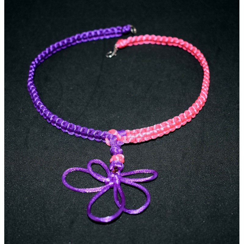 Ce magnifique collier en noeud chinois est fait de 2 Cordons queues de rats satinés rose et violet