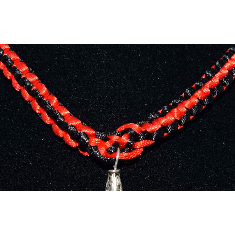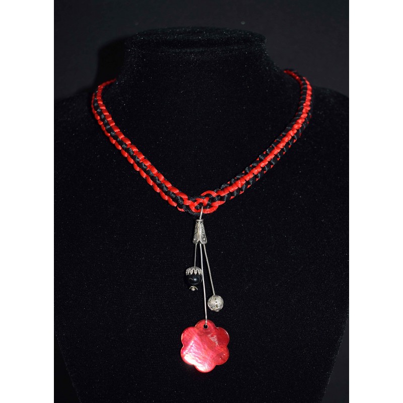 Ce magnifique collier en noeud chinois est fait de 2 Cordons queues de rats satinés noir et rouge orné de breloques : fleurs en nacre rouge et perle fine noire et métal ciselé