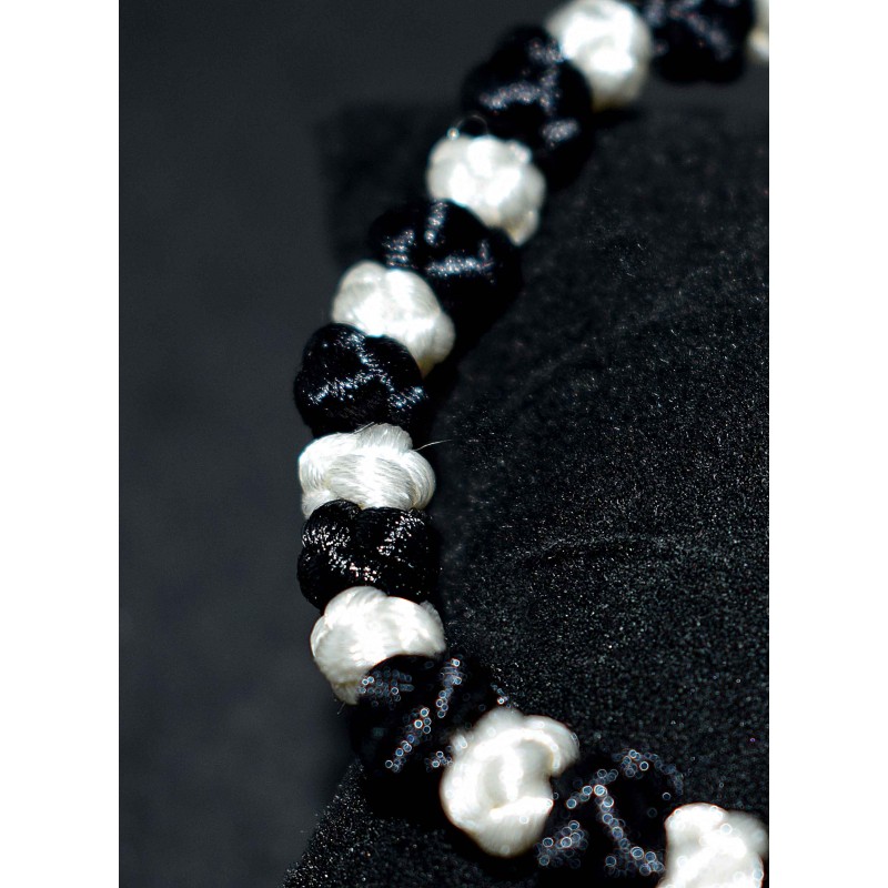 Ce magnifique bracelet en noeud chinois est fait de 2 Cordons queues de rats satinés noir et blanc