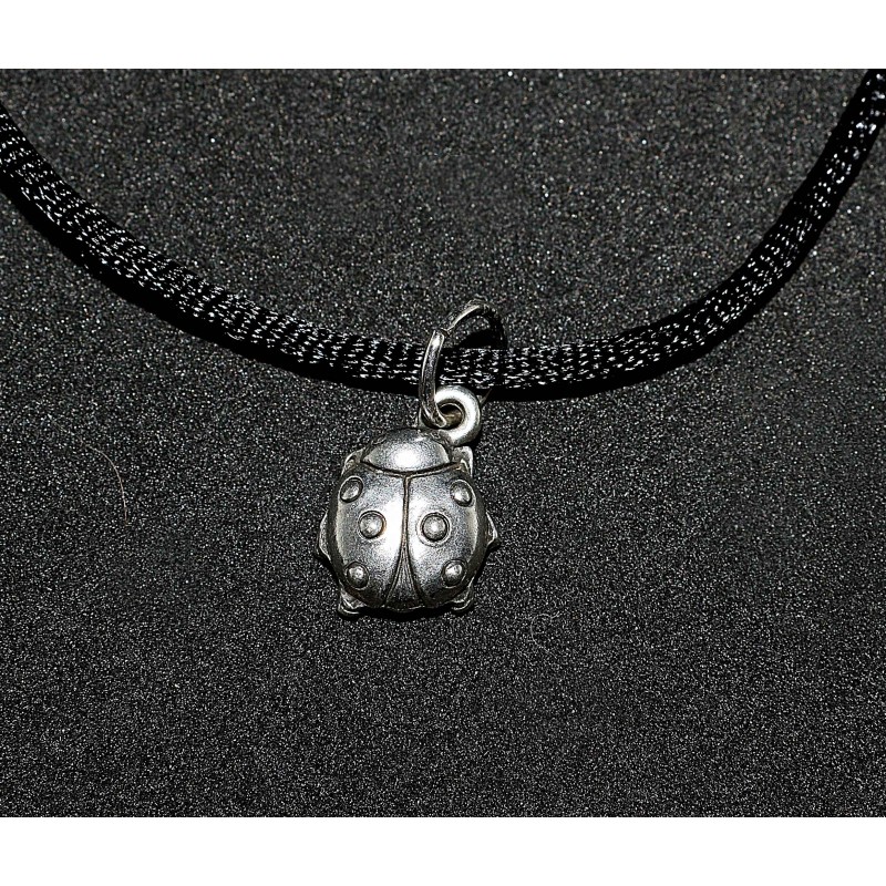 Bracelet en queue de rat satiné noir simple, fermoir noeuds chinois "boules" et breloque coccinelle argenté