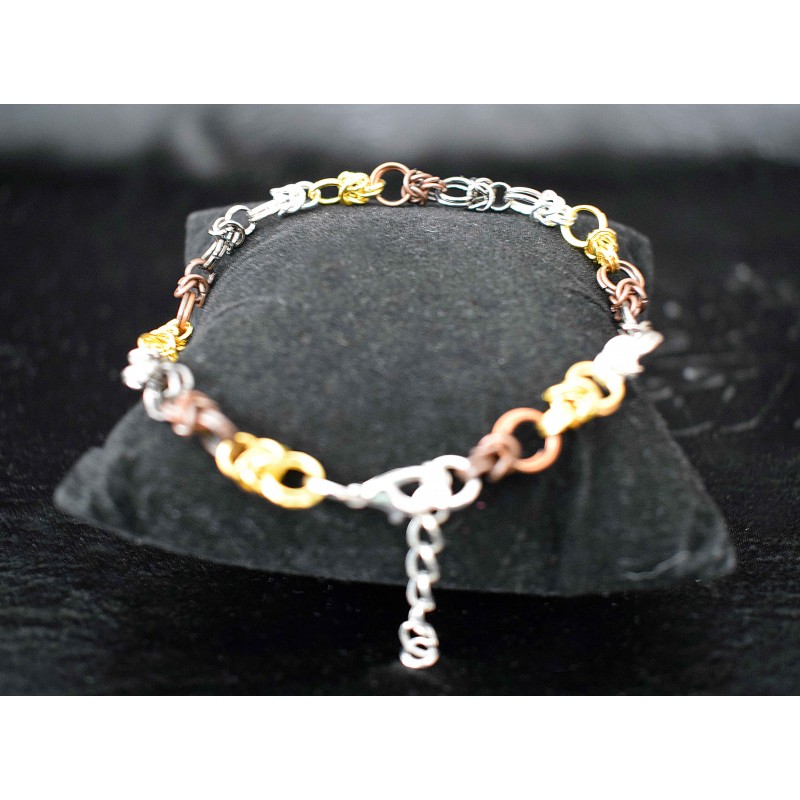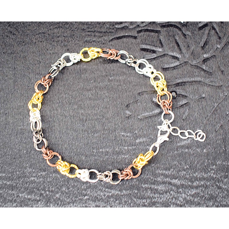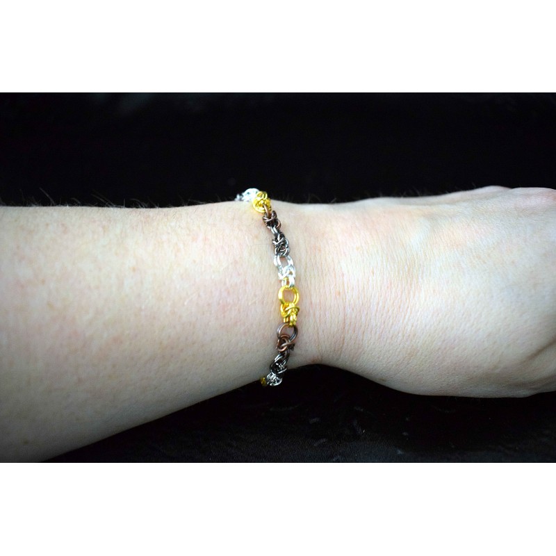 Bracelet chaine maille composé de petits anneaux de 4 couleurs : dorés, bronzes, noirs et argentés.