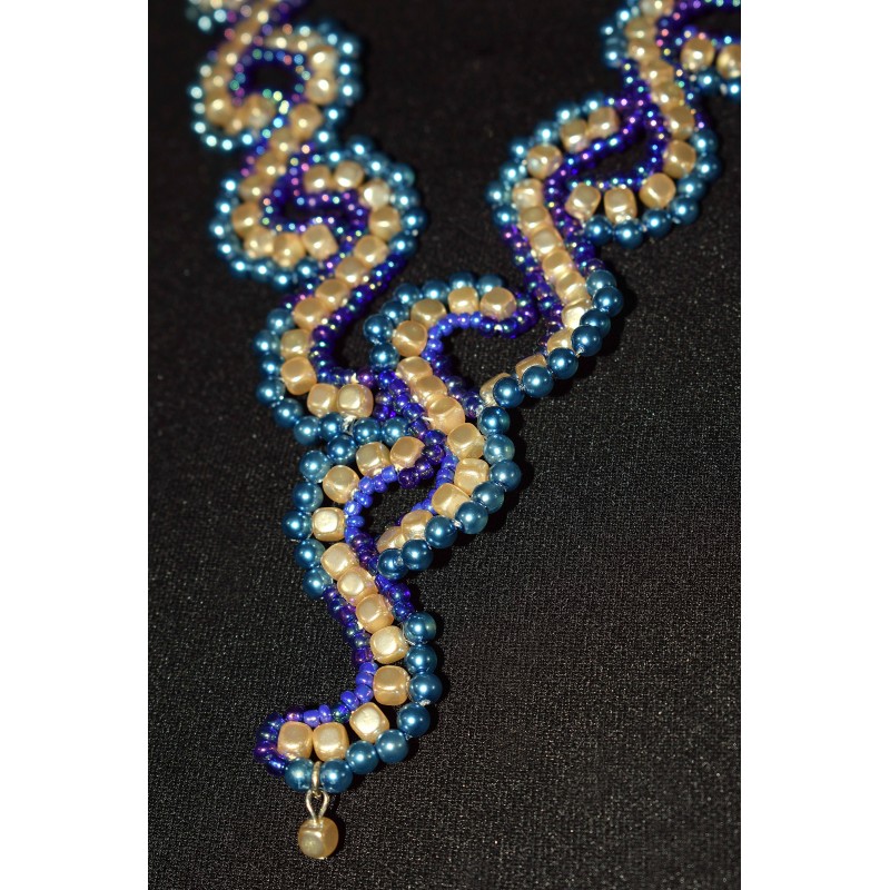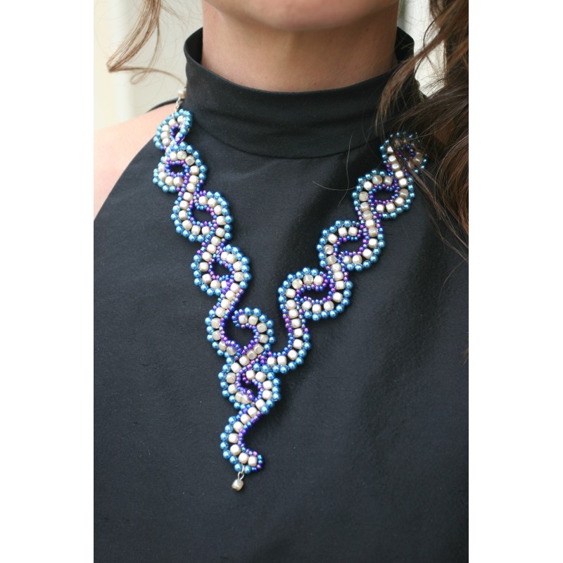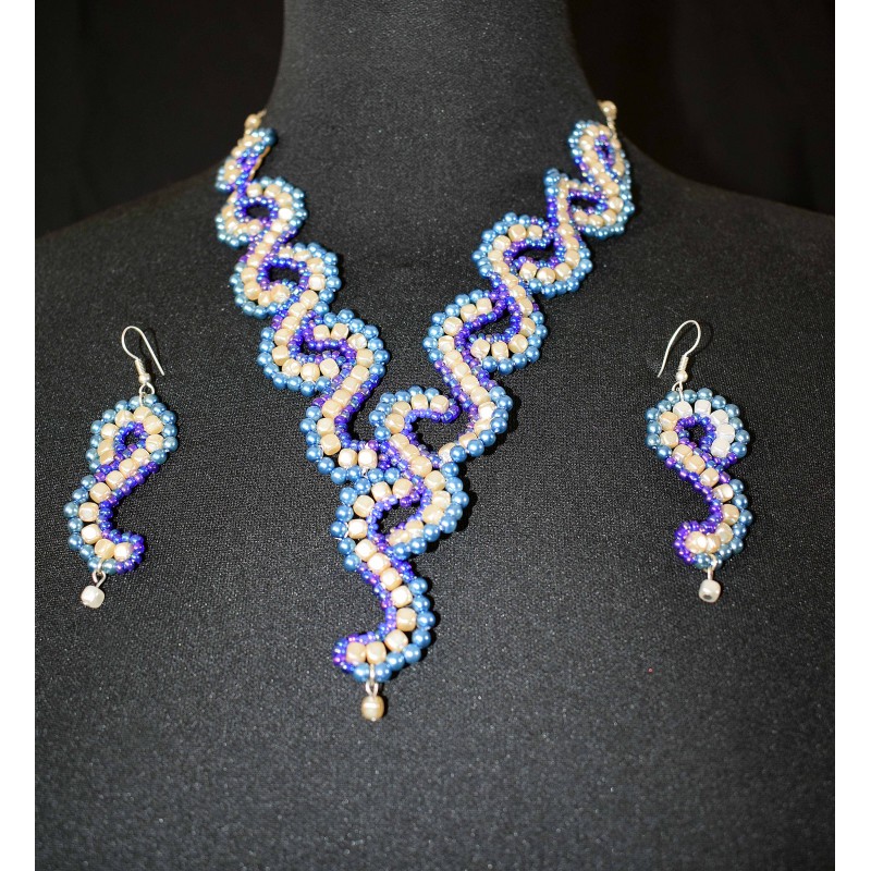 Voici une élégante parure constituée d'un collier et de boucles d'oreilles. Ils sont réalisés en perles fines bleues et blanches.