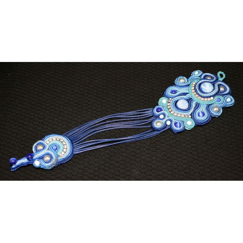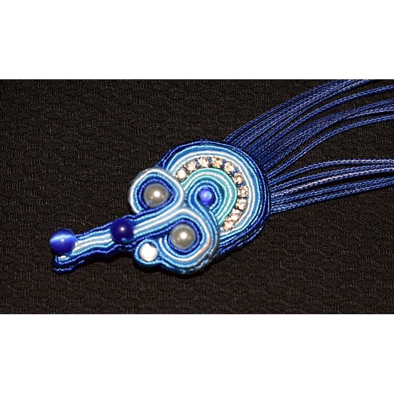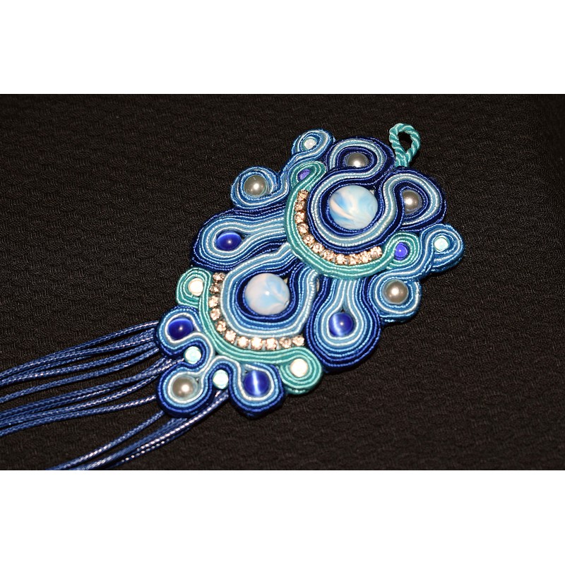 | Compositions | soutache, perles, chaine strassée et skaï bleu foncé |