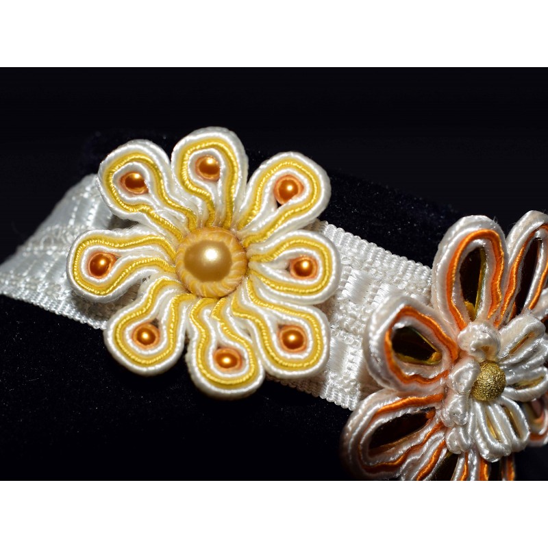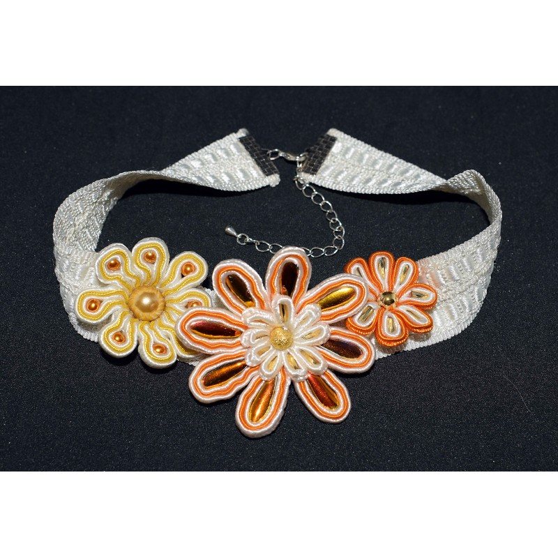 Ras du cou en galon crème, très original. Les fleurs sont réalisées en soutache blanche, jaune et orange avec diverses perles tel que des perles fines, des rocailles twist, des métals, des dagues et une diamantées.