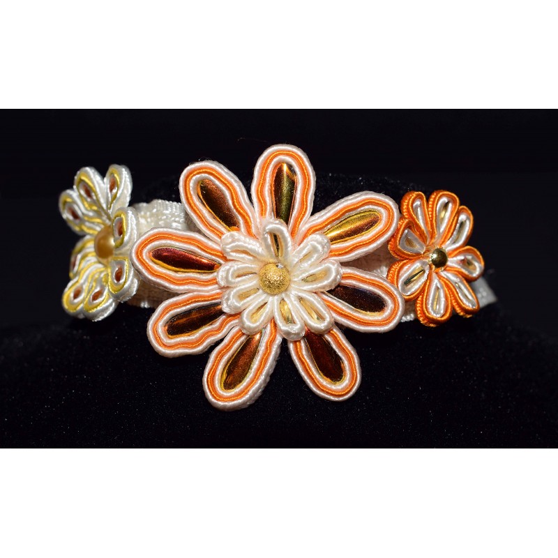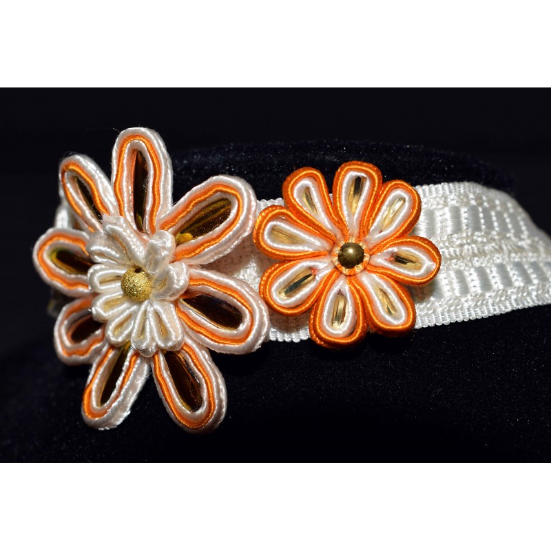 Ras du cou galon crème et soutache blanche, jaune et orange aux 3 fleurs et perles diverses