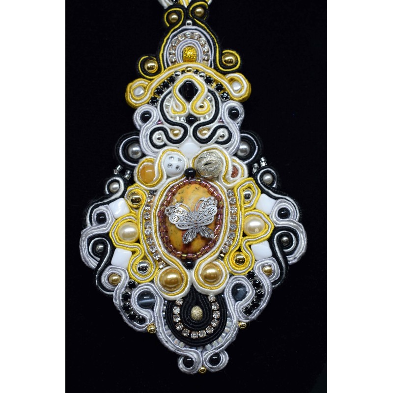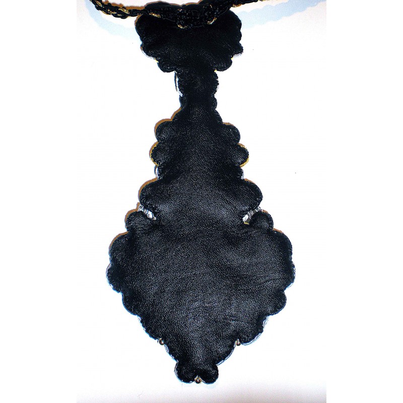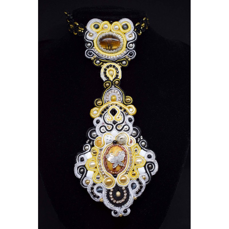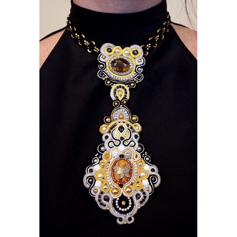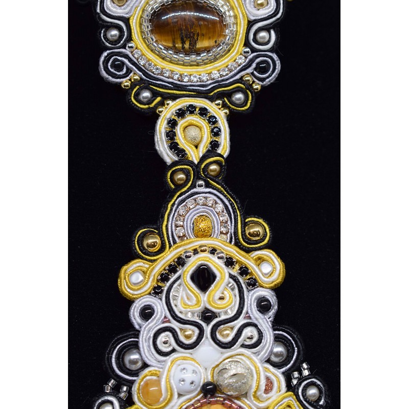 Cravate en soutache dorée, noire, blanche et argentée avec une multitude de perle, cordon noir et doré et velcro
