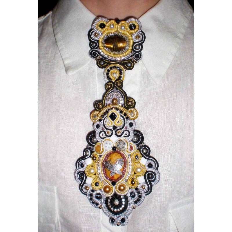 Voici une magnifique cravate réalisée en soutache de couleur dorée, noire, blanche et argentée . Elle sera l'alliée idéale pour vos tenues de soirée, de fêtes........Le petite touche originale qui saura vous rendre encore plus unique et inoubliable.