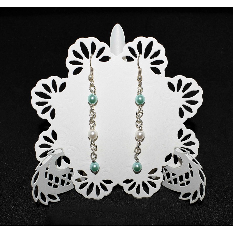 Parure composée d'un bracelet et de boucles d'oreille argentées en wire wrapping, perles blanches et turquoises, perles fines blanches et vertes d'eau