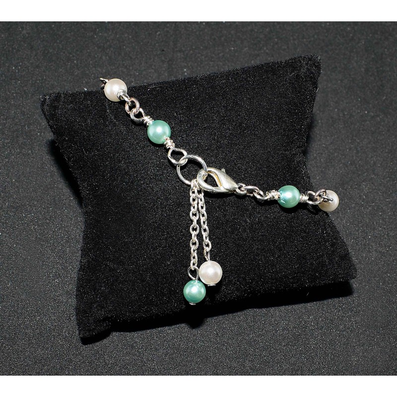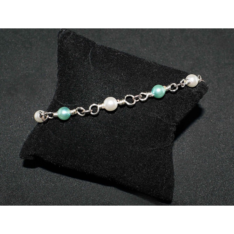 Voici une Parure composée d'un bracelet et de boucles d'oreille argentées en wire wrapping, perles fines blanches et vertes d'eau et petite chaine argentée.