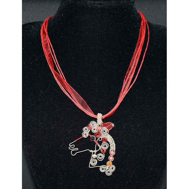 Voici un magnifique collier réalisé en wire wrapping et perles pour tous les amoureux des chevaux. Le fil de laiton est argenté structuré et le fil d'aluminium est rouge. Les perles rouges sont des perles miracles, et les perles blanches et noires sont des perles fines.