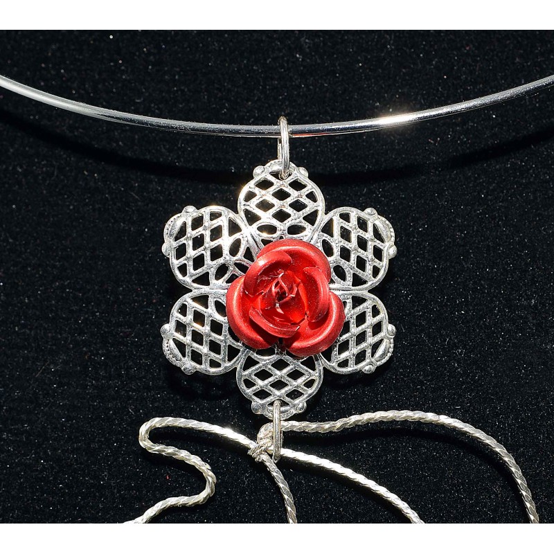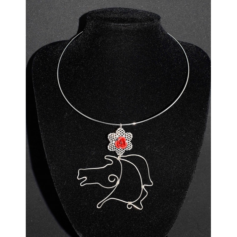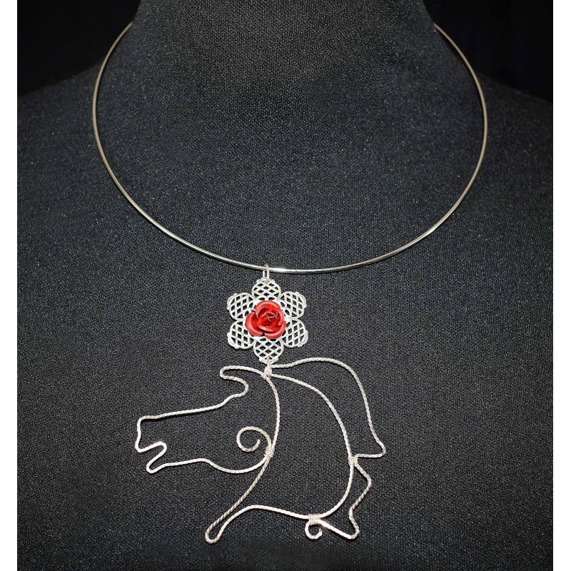 Collier en wire wrapping argenté au cheval et à la rose métallisée rouge