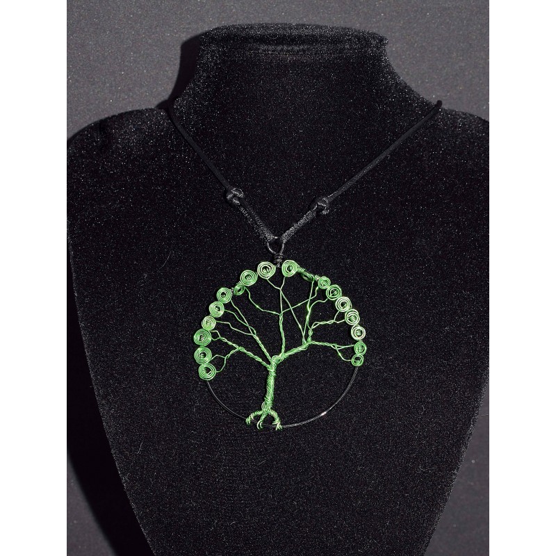 Le fil métal est un fil d'aluminium vert et son tour de cou est en queue de rat noire satinée. Vous pourrez aisément ajuster le tour du coup, grâce à des noeuds boules chinois qui coulisseront pour l'agrandir ou le rétrécir selon vos envie.