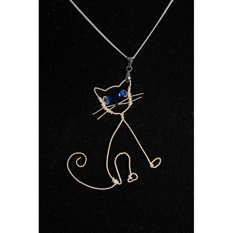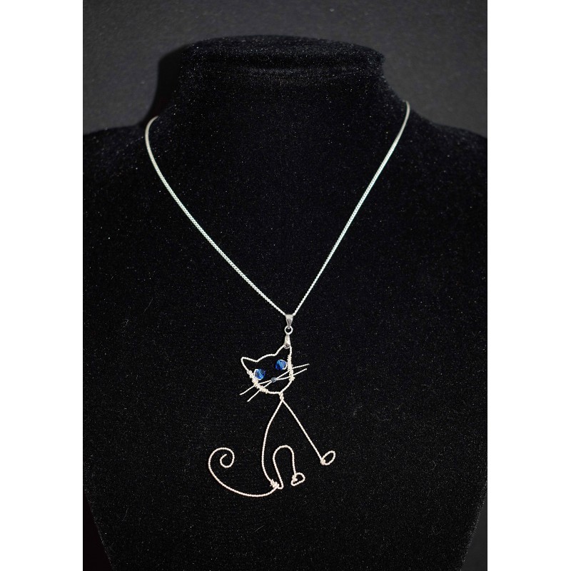 Voici un collier très original pour tous les amoureux des chats. Il s'agit d'un collier réalisé en wire wrapping en fil de laiton argenté Orné de cristaux Swarovski® bleu.