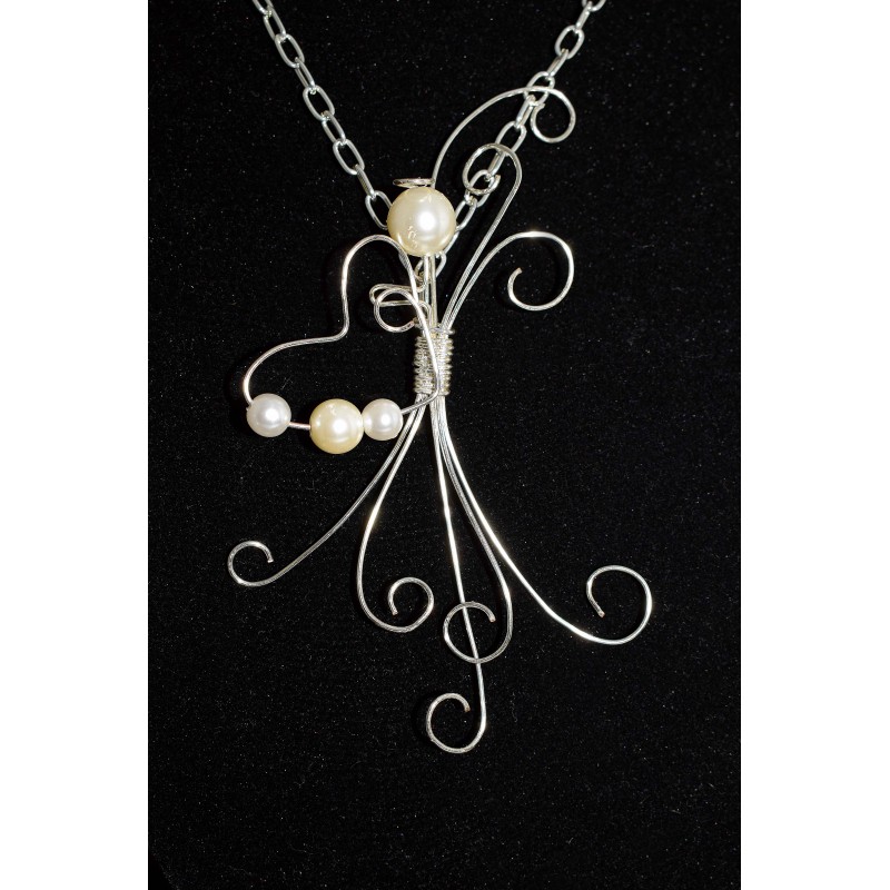 Collier argenté en wire wrapping «ange au coeur» et ses perles fines blanches